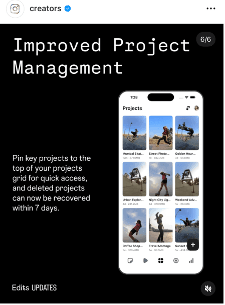 Auch organisatorisch wird Edits hilfreicher. Wichtige Projekte kannst du jetzt oben im Projekt-Grid anheften, damit du schneller darauf zugreifen kannst. Zusätzlich lassen sich gelöschte Projekte bis zu 7 Tage lang wiederherstellen, was kleine Fehler deutlich entspannter macht.